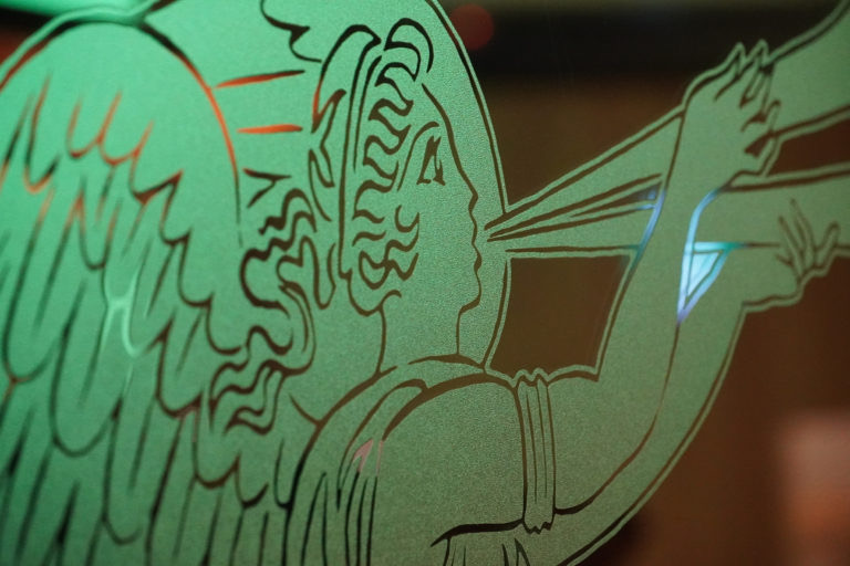 飛沫防止のアクリルパネルはアートデザインが施されていました。