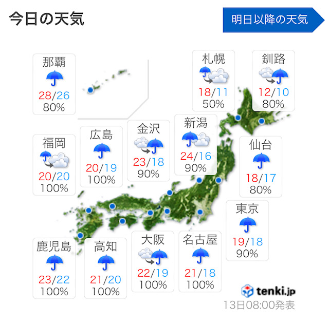 全国の天気予報図、見事に全部「雨」