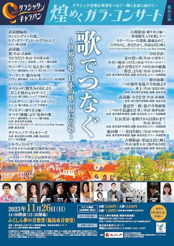 皆様おはようございます。 OTTAVA fresca 水曜日のプレゼンター、本田聖嗣です。 昨日の東京は、朝の荒天のあと、日中は晴れて気温が上がり、体感としては9月か10月はじめ、まだ夏の終わり・・という感覚でした。確かに今年は以上に暑く長い夏が続いたようです。ただし、今週から次第に気温は低下して、来週はかなり涼しくなるようです。 体調にはお気をつけください。 今日も9時台には月曜日にお届けしていた「世界の気になるニュースから」、とりあげます。パレスチナ情勢も、ウクライナ情勢も、双方の勢力が強硬なまま、戦闘だけが続き、犠牲は増え・・という悲惨な状況になっています。中東情勢は特に早めの講和を、または人道停戦を・・という努力はされているでしょうが、はやく光明が見えてほしいものです。ウクライナ情勢も、これから冬の厳しい季節になるので、微妙な時期に差し掛かってきています。ロシア軍は明確に弱体化していますが、まだウクライナ軍が大規模に占領地を取り返す情勢になっていないところが、なんともやりきれないところです。 生放送ですので、リクエストお待ちしております。クラシック曲のリクエストは、曲名を挙げていただいても、私に選曲をお任せいただくフレーバーリクエストでも結構です。また、いつもの通り、リクエスト以外の普通のお便りも大歓迎です。時事の話題、季節の話題、音楽の話題、その他日常の話題、幅広くどんな話題でもお待ちしております。 いただいたお便りは、私のみならず、全世界のリスナーさんとシェアさせていただきます。 プレゼンター本田宛、メールアドレスは、[email protected]です。 それでは、9時の放送開始をいましばらくお待ちください。 本田聖嗣 (写真は、少しずつ色づき始めている、東京の紅葉と、今月末26日、福島にて、歌声があふれるコンサートに出演いたします、そのフライヤーです。)