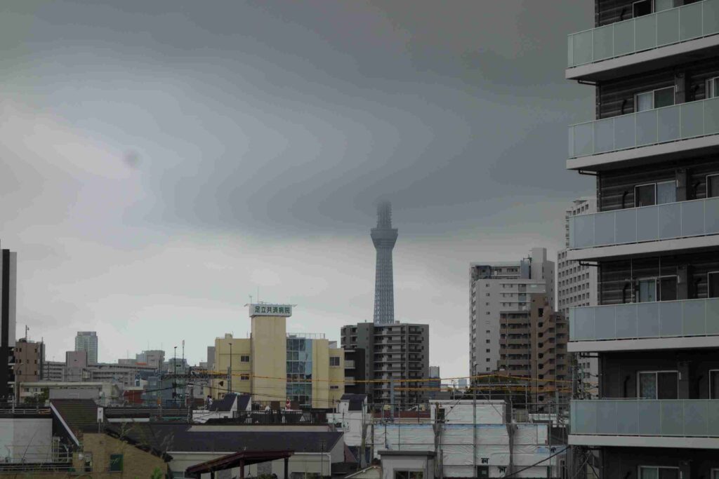 足立区から見る東京スカイツリー、2枚の写真を掲載。雲が低くタワーの先端が見えないレア写真。