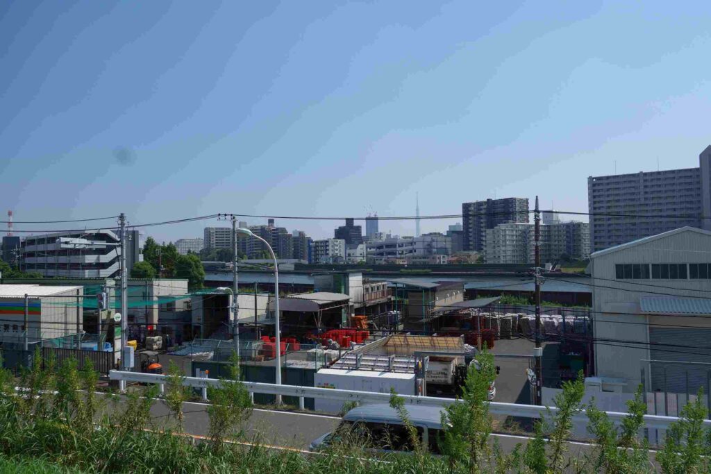荒川の土手から見る1枚は、目の前に隅田川が流れ、つまり荒川と隅田川の間に立っているのだ。
