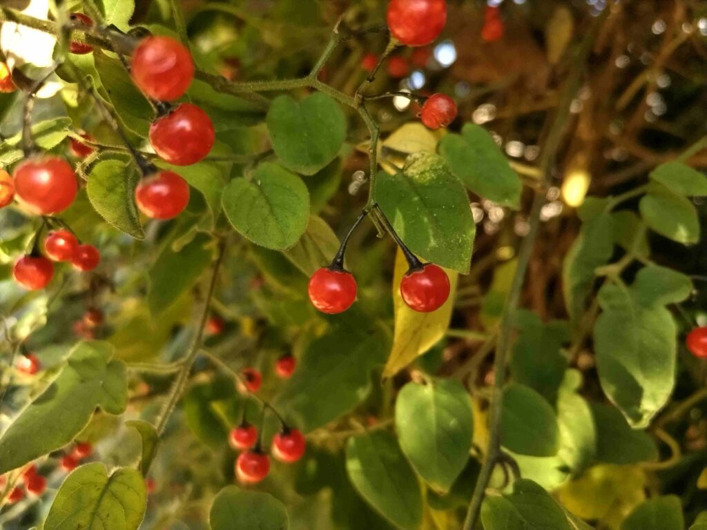 冬でも色鮮やかな赤い実を茂みの中に見つけることができます