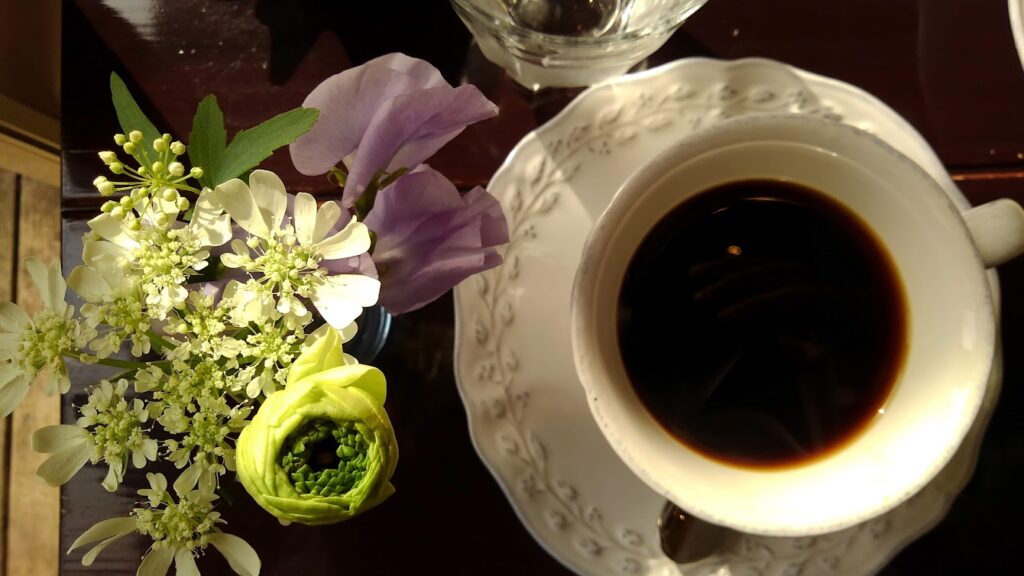 生花がテーブルに飾られている喫茶店はコーヒーも美味しいし、記憶に残りますね。