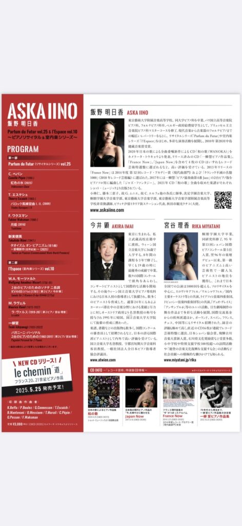 皆様おはようございます。 OTTAVA fresca 水曜日のプレゼンター、本田聖嗣です。 あっという間に4月もラストの水曜日、お仕事の都合によっては先週末からゴールデンウィークというかたもいらっしゃると思います。この期間は変わりやすい天気の東京のはずなのですが、長期予報を見ると、2日に崩れそうなものの、あとは晴天の予報がおおく、今年はかなり特別な、晴天の続くGW週間となりそうです。5月3~5日は、東京有楽町の東京国際フォーラムで開かれる、ラ・フォル・ジュルネ音楽祭にOTTAVAは恒例の公開収録放送ブースを出展します。私も5日の前半を島田優理子さんと担当予定です。 今日も、9時台は世界の気になるニュースからを取り上げます。第2次大戦戦勝記念日停戦などを申し出ていますが、ロシアは戦争をやめる気はなく、また仲介者の米トランプ政権が、いよいよ市場の混乱を呼び込みつつあり、内政で躓きそうなため、ウクライナの仲介どころではなくなっていくような気がします。果たして、ウクライナ戦争の行方と、ヨーロッパのスタンスは・・・気になるところです。 生放送なので、リクエストお待ちしております。クラシック曲のリクエストは、曲名を挙げていただいても、私に選曲をお任せいただくフレーバーリクエストでも結構です。もちろん、リクエスト以外の普通のお便りも大歓迎です。音楽の話題、日常の話題、ゴールデンウィークの話題、その期間中に食べたいおいしいもの、幅広くどんなテーマでもお待ちしております。頂いたリクエスト曲によって、番組の曲が変化してゆきます。 いただいたお便りは、私のみならず、全世界のリスナーさんとシェアさせていただきます。 プレゼンター本田宛、メールアドレスは、[email protected]です。 そして、今日は11時台にゲストをお迎えします。ピアニストの飯野明日香さん、5月25日に発売予定の、フランス語で「道」という意味の「Le Chemin」のタイトルを持つCDの発売記念リサイタルを東京文化会館小ホールで5月21日に開催されます。フランスの20~21世紀のピアノ曲のレパートリーということで、インタビューが楽しみです。5月21日のリサイタル、リスナーさんプレゼントもある可能性大ですので、お聞き逃しなく! それでは、9時の放送開始をいましばらくお待ちください。 本田聖嗣 (写真は、飯野さんのコンサートのフライヤーです。) 放送後追記:飯野さんの下記のリサイタルに、OTTAVAリスナーさん、ご招待をいただきました! ご希望の方は、メールの件名に「リサイタルチケット希望」と入れていただき、 当日チケットの引き換えとなる「お名前」、「メールアドレス」「万が一の電話番号」を お書きいただき、1枚か2枚の希望とともに、[email protected]までお送りください! 5月14日(水)のOTTAVAfresca放送を締め切りとさせていただきます。 フランスの21世紀のピアノ音楽と、楽しい2台ピアノが楽しめる貴重なコンサートです!