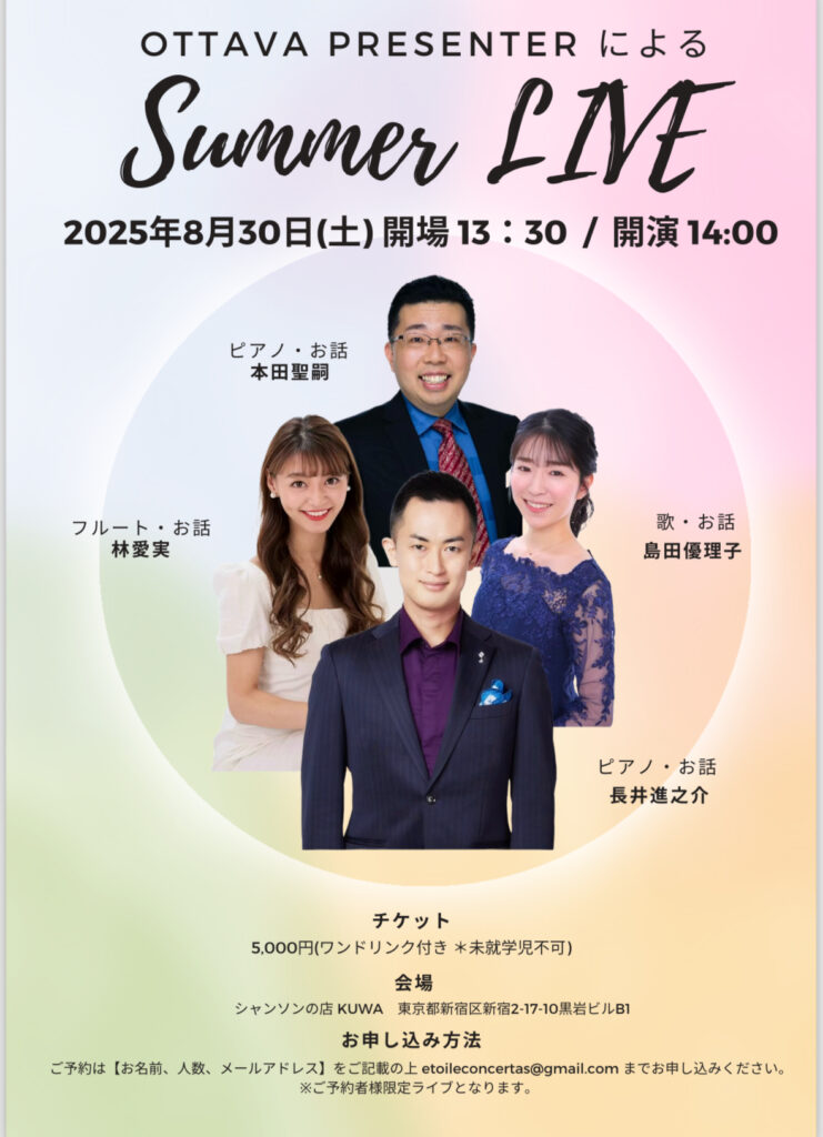 8月30日(土)午後2時から、本田聖嗣さん、長井進之介さん、林愛実さんとのコンサートが決定♪