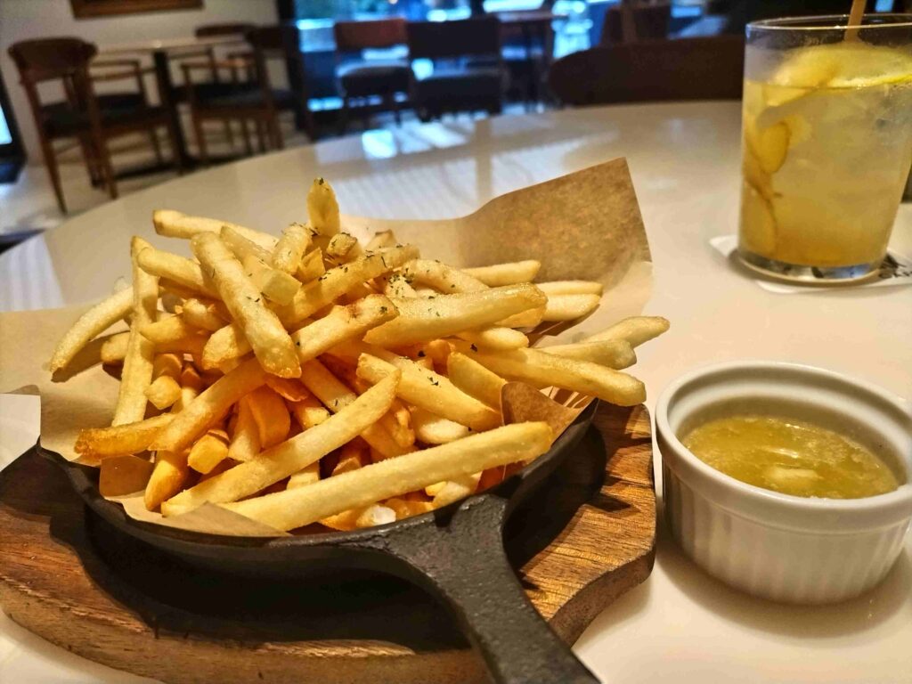 サントリーホールに向かって右隣のテレビ朝日のさらに右隣にあるアークヒルズカフェにて。開演前に小腹が減っているときにはこれを、と店の人が勧めてくれたのが、山盛りフライドポテト(700円)。さっくさくの揚げたてポテトにニンニクバター熱々ソースをつけて食べると、罪な味が半端ないです。自家製ジンジャーエール(750円)は砂糖漬けの輪切りショウガがたっぷり入ってて、これも美味しかったです。