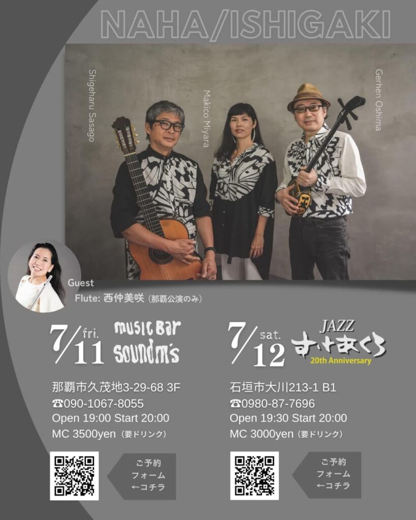 ※ジュス(笹子重治:作曲編曲ギター、ゲレン大嶋:作曲作詞三線、宮良牧子:歌)が、今週那覇と石垣島に行きます!ぜひ!!