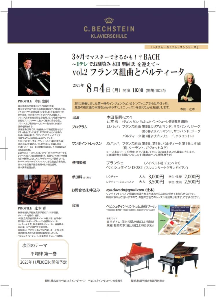 皆様おはようございます。 OTTAVA fresca 水曜日のプレゼンター、本田聖嗣です。 首都圏関東は、ほぼ例年どおりの梅雨明けとなり、猛暑が続いています。実感としては梅雨明けが早すぎのような猛暑がすでに6月からありましたが、いよいよここからが本番、関東では激しいゲリラ雷雨も怖いですし、なにより、室内での熱中症にも気を配らなければなりません。ぜひ、皆様もお気を付けください。 9時台は世界の気になるニュースからを取り上げます。ロシアの経済や産業はじわじわマヒしてきていますし、戦場では、もう戦車も出せないぐらい弱体化したロシア軍ですが、北朝鮮軍の援軍もあり、相変わらず、兵士と、軽装備と、砲弾やドローンだけは豊富にあり、ウクライナ軍を悩ませています。しかし、トランプ新政権騒動も一段落し、西側各国のウクライナ援助にも、また力が入り始めました。ウクライナとしては、戦場での勝利を目指さない限り、国土の回復はありえない、ということがはっきりしてきましたので、ロシア軍の夏季攻勢をしのいだ今、冬までに反転攻勢といけるかが焦点だと思います。 今日はドメニコ・スカルラッティの命日なので、彼の作品を多めにお届けします。 先々週の、田中あかねさんプロデュース「シューベルトチクルスチケットプレゼント」は、今日の放送終了まで受け付けております。ぜひ下の欄をご覧ください。 グルメの話題は、猛暑の時、食欲が落ちても食べやすいものなら、なんでもあり、です。私は暑くても決して食欲が落ちないので?!どんなものがいいのか困っています・・。 生放送なので、リクエストお待ちしております。クラシック曲のリクエストは、曲名を挙げていただいても、私に選曲をお任せいただくフレーバーリクエストでも結構です。もちろん、リクエスト以外の普通のお便りも大歓迎です。音楽の話題、猛暑の話題、冷たいもの話題、日常の話題、スカルラッティの話題、幅広くどんなテーマでもお待ちしております。頂いたリクエスト曲によって、番組の曲が変化してゆきます。 いただいたお便りは、私のみならず、全世界のリスナーさんとシェアさせていただきます。 プレゼンター本田宛、メールアドレスは、sh@pyyhjx.netです。 それでは、9時の放送開始をいましばらくお待ちください。 本田聖嗣 (写真は、本日は宣伝2つさせてください。来る8月4日に東京日比谷のベヒシュタインサロンで、パリ仲間の辻本彩先生と開催するチェンバロVSピアノのバッハ講座、2回目のフライヤーです。今回は舞曲がテーマです。お申し込みは、aya.clavesin@gmail.comまで!チェンバロとピアノという音律が違う楽器で同時にバッハが聞ける貴重な機会でもあります。 そして、前回テレビとともにご好評いただいだ「3マス」シリーズの続編?ともいうべきMOOK 「3カ月でマスターするMOOK ピアノ もっと弾きたいこの3曲!」が26日に新発売となります。こちらもよろしくお願いします。https://www.amazon.co.jp/NHK3%E3%81%8B%E6%9C%88%E3%81%A7%E3%83%9E%E3%82%B9%E3%82%BF%E3%83%BC%E3%81%99%E3%82%8BMOOK-%E3%83%94%E3%82%A2%E3%83%8E-%E3%82%82%E3%81%A3%E3%81%A8%E5%BC%BE%E3%81%8D%E3%81%9F%E3%81%84%E3%81%93%E3%81%AE3%E6%9B%B2-%E6%95%99%E9%A4%8A%E3%83%BB%E6%96%87%E5%8C%96%E3%82%B7%E3%83%AA%E3%83%BC%E3%82%BA-%E6%9C%AC%E7%94%B0/dp/4144073327/ref=sr_1_2?crid=1UNBZEYT40G9E&dib=eyJ2IjoiMSJ9.iym7kaJePRLTvRdLQj09m31fdj359vtRLkrKFTVthUXyDXovq4iSctpZeQ1FH_1bIGtVwNsje6TPe770uJep5IBoKyc49JxDVr7r9m0aty2qX2B9aDXrIE_vVOYQn3IZQR5Nh1IG3KEYy3dYv8iUvpA9rW3uMIn2t19-QeUWS1DUl6Z2n0Uhf9u5Rd5iUkcqD2t4YYXnq2a5Mawh1Qh3zSOPiTZz1G9nUu4H8kBpamDDuZFDBlgDG5iUuTwtbMNJkZ_VNNyaLH-wW3Zfbp0AT31CtsZ4Pc9ic3Zl0nent6I.HpfqCaEH6brrXdopyLz7XbNSNMRGSOED1ozqkPhv6Kw&dib_tag=se&keywords=3%E3%81%8B%E6%9C%88%E3%81%A7%E3%83%9E%E3%82%B9%E3%82%BF%E3%83%BC%E3%81%99%E3%82%8B%E3%83%94%E3%82%A2%E3%83%8E&qid=1753203511&sprefix=3%E3%81%8B%E6%9C%88%2Caps%2C173&sr=8-2)