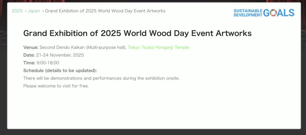 そして、11月21日から24日にかけて、東京・築地本願寺を会場として《World Wood Day 2025 in Japan》会期中のさまざまな制作イベントで誕生した多数の作品や、IWCS国際木文化学会の貴重な収蔵品などが展示される他、様々なワークショップも行われる、”最終展示会”を開催します。