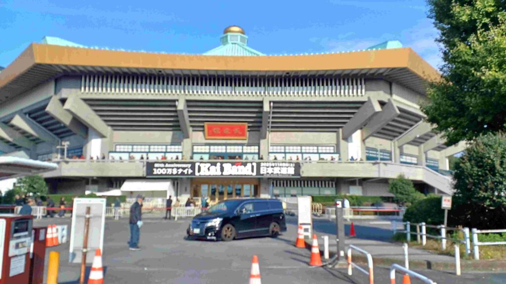 駐車場にバスを止めて、武道館の横を通って行くわけで、その日のライブの看板を見て