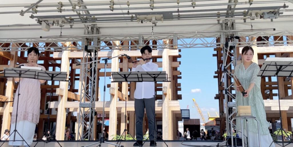 この写真は、番組内で紹介する予定の一曲、先日に《EXPO2025大阪・関西万博》会場内で開催した【木の文化の音楽祭】のオープニングを飾った作品<松尾祐孝作曲/日輪燦燦〜雅楽三管の為の幻想曲)のステージ風景です。演奏者は、左から、鈴木絵理さん(篳篥)、〆野護元さん(龍笛)、中村華子さん(笙)です。背後に見えるのが大屋根リングです。