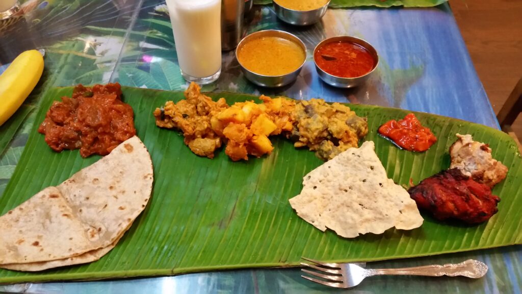 (画像は、外で食べたくなるスリランカのカレー料理です。バナナの葉にのっています。)