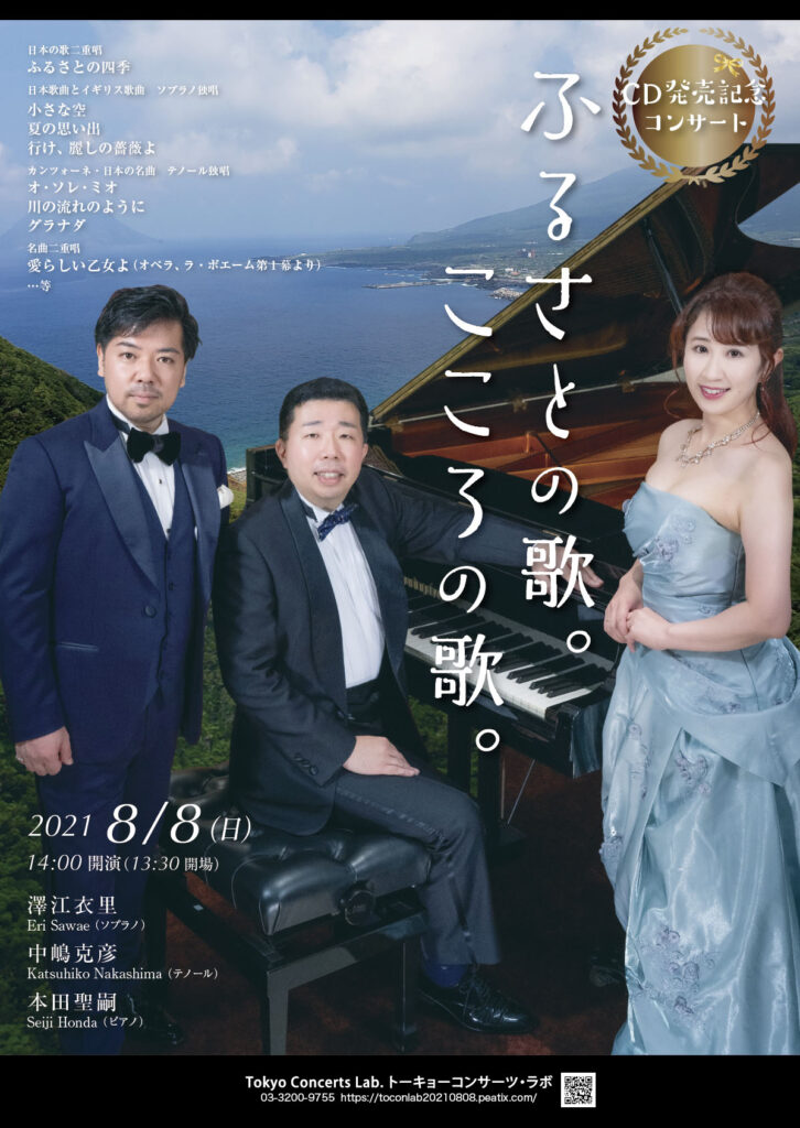 天王洲で、まだ夜のOTTAVA saloneを担当させていただいていた2018年、延長放送のところで八丈島の演奏会でのライブ録音をお届けしたところ、「ぜひ聴きたい!」と嬉しいご意見を頂いた、日本唱歌メドレー「ふるさとの四季」。 ソプラノの澤江依里さんと、テノールの中嶋克彦さんと、私で演奏した、この「誰でもが懐かしさを感じてしまう曲」が、2年の時を経て、ついにCD化されます。 実は、CD発売記念コンサート、昨年に予定していたのですが、御存知の通りのコロナ禍、緊急事態宣言、と実現せず、延期、再延期、再々延期をくりかえしたのですが、ついに、8月8日(日)14時から、東京・早稲田のトーキョー・コンサーツ・ラボで 第1回目の「CD発売記念コンサート」を行うことが決定いたしました! 恐れていた緊急事態宣言が発出ということになり、会場の半分以下のお客様しかお迎えすることができませんが、事前受付が東京コンサーツの電話と Peatixのサイトで始まっております。 会場は、もともと制限されていた席数がさらに少なくなる見込み、ひょっとしたら、早めに完売・・となるかもしれませんので、ひとまず皆様にお知らせ申し上げます。 東京コンサーツ チケット予約電話:03-3200ー9755 または チケット予約サイト: https://toconlab20210808.peatix.com/