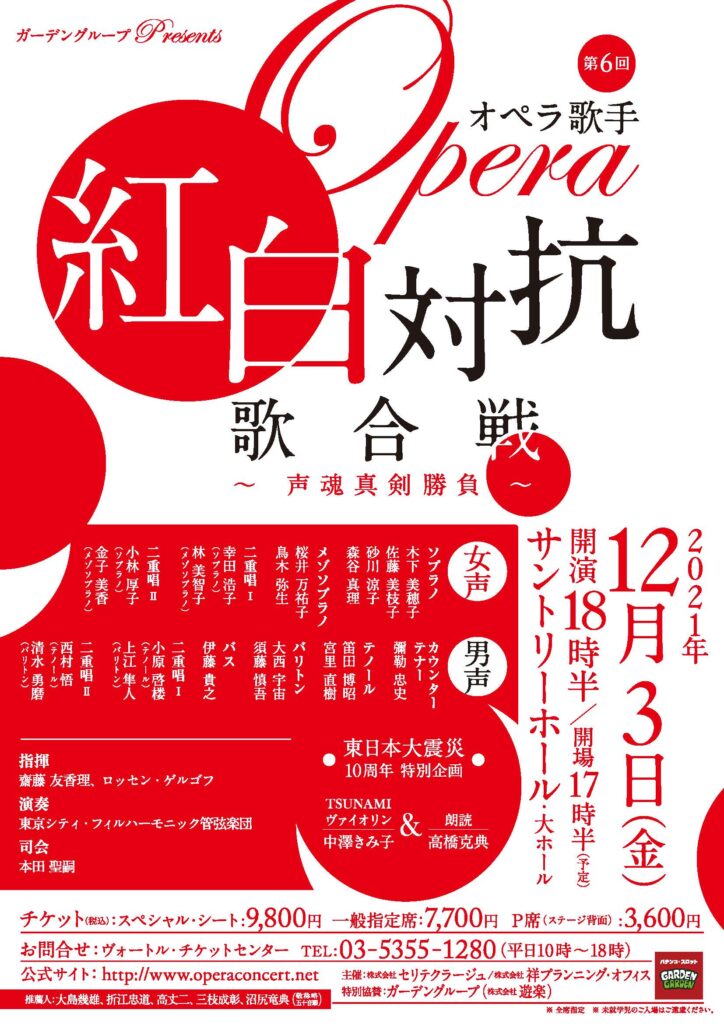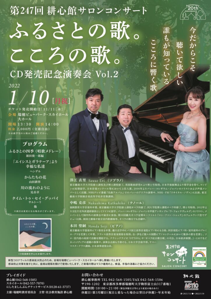 皆様おはようございます。 OTTAVA fresca 週前半のプレゼンター、本田聖嗣です。 先週は、気持ちの良い晴天の日が多かった東京ですが、今週前半は、少しお天気があれそうな気配です。そして、この時期お天気が崩れると、その後は確実に冬が近くなりますので、皆様、温度調節はこまめにしてお過ごしください。 さて、今年の夏は東京も大変だったコロナ禍ですが、不思議と新規感染者数も下がり、医療体制も立て直しがされてきたようです。長く続いた緊急事態宣言もなくなり、少しずつですが、東京の街にも「以前の日常」が少しずつ戻ってきたような気がします。 私ごとですが、先週末、急に頼まれて、パリ時代の古い友人の音楽会で弾いてきました。考えてみれば、「前半・後半があり、2時間程度のフルの演奏会に出演する」というのがもう随分久しぶりだったような気がします。まだまだ、感染症対策は気が抜けず、ホールなどもフルキャパシティーが許可されるところばかりではありませんし、お客様にはマスク・消毒をお願いしておりますが、その中でも、長く中止・延期がされてきた演奏会が復活しつつある手応えを感じました。12月、またステージに幾つか立つので、下の方で、宣伝させて下さい。 月曜日の9時台は気になる世界のニュースです。産油国が増産に応じなかったのは、「またコロナ禍の影響が全世界で出かねないため」、だそうですが、世界的にはそう見る動きのほうが強いようです。日本はこの点、不思議と恵まれています。 メールのテーマは、いつもの通り、完全にフリーです。季節の話題、音楽の話題、日常の話題、旅の話題、どんな内容でも結構ですので、お送り下さい。 曲のリクエストも、もちろん受付ます。曲名を挙げてでも、「こんなシチュエーションにあう曲を・・・」というような、私に選曲を任せていただく「フレーバーリクエスト」も大歓迎です。 また、オンデマンドでお聞きの皆様も、どしどしメールをお送りください。その次の担当放送日でリクエストにお応えします。 いただいたメールは、全世界のリスナーさんと話題をシェアさせていただきます。 プレゼンター本田宛は、いつものメールアドレスです。 sh@pyyhjx.netにお送りいただけたら幸いです。 それでは、9時の放送開始まで、しばらくお待ち下さい。 本田聖嗣 12月3日(金)は、もうすっかり恒例となりました、「第6回 オペラ紅白歌合戦~声魂真剣勝負」が東京・赤坂のサントリーホール大ホールで開催されます。日本を代表する若手からベテランまでのオペラ歌手が勢揃い、本当に紅が勝つか白が勝つかの真剣勝負です。今年は、震災後10年、特別な朗読とヴァイオリンの演奏もあります。不肖私、いつものように司会を努めます。ただいま曲目解説執筆に、全力投球中でもあります! http://operaconcert.net/ 12月29日(水)は、同じサントリーホール・ブルーローズで、日本の「やまと舞」とクラシック音楽の共演。こちらはピアニストとして、世界的オペラ歌手大村博美さんと共演のほか、ソロも弾いたり、アンサンブルも弾いたりします。和の心と、クラシックの心がコラボする、斬新な演奏会「やまとの季(とき)」こちらも、チケット販売がスタートしました。 https://t.pia.jp/pia/event/event.do?eventCd=2130504 1月10日(月祝)は、東京・瑞穂町スカイホールで、「ふるさとの歌。こころの歌。」CD発売記念コンサート第2段を行いますが、こちらでは、CDに収録していない、新たな曲を前半お届けする予定です。 そういえば! CD自体は、OTTAVA SELECT SHOPで好評発売中ですが、今週11月10日、いよいよ全国CD店、amazonなどで、一般販売開始です! しかし、「3人のサイン色紙」がついてくるのは、OTTAVA SSのみですので、お見逃しなく! https://www.kinginternational.co.jp/genre/tcr-2021B/ https://www.hmv.co.jp/artist_-%E3%82%AA%E3%83%A0%E3%83%8B%E3%83%90%E3%82%B9%EF%BC%88%E5%A3%B0%E6%A5%BD%EF%BC%89_000000000060366/item_%E3%80%8E%E3%81%B5%E3%82%8B%E3%81%95%E3%81%A8%E3%81%AE%E6%AD%8C%E3%80%82-%E3%81%93%E3%81%93%E3%82%8D%E3%81%AE%E6%AD%8C%E3%80%82%E3%80%8F-%E6%BE%A4%E6%B1%9F%E8%A1%A3%E9%87%8C%E3%80%81%E4%B8%AD%E5%B6%8B%E5%85%8B%E5%BD%A6%E3%80%81%E6%9C%AC%E7%94%B0%E8%81%96%E5%97%A3_12296787 https://tower.jp/item/5263469 https://www.amazon.co.jp/dp/B09HY1P3PL (写真は、それぞれの演奏会のフライヤーです。)