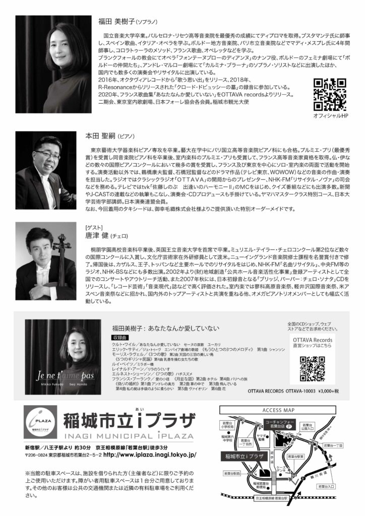 放送後追記:OTTAVAのセレクトショップでも好評発売中の アルバム「あなたなんか愛していない」(https://ottava.official.ec/items/27128320)の延期に延期を重ねた、 発売記念コンサート第2段を、まさにこのCDを収録した東京・稲城市のアイプラザホールにて行います。 日時 2022年4月9日(土) 午後2時開演(午後1時30分開場) https://eplus.jp/sf/detail/3587730001-P0030001P021001?P1=0175(チケットはこちら) CDに収録されたフランスの歌曲はもちろんのこと、 ピアソラ作品、日本歌曲作品、また、OTTAVAのサロン・コンサートにご出演いただいたこともあるチェロの唐津健さんをゲストにお迎えして、 サティの歌曲のトリオバージョン、 ドビュッシーのチェロ・ソナタなども演奏いたします。 ホールで行いますが、フランスのサロン的楽しい音楽会になりそうです。